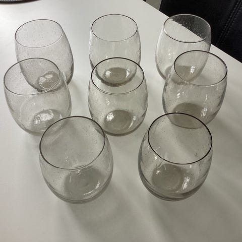 Pernille Bülow mundblæste drikkeglas “Reuse” lavet af apoteksglas og hvert glas med sit eget mønster af bobler. Ti styk. Sælges samlet. Den lille version (8x9 cm) men det er ikke et lille glas. Perfekt til vand eller til en sjus.