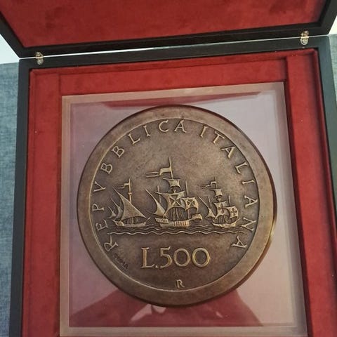 Mønt med et mindemønster kendt som “Caravelle”, for repræsentationen af tre karaveller, der sejler fuldt sejl på bagsiden, symbol på Italiens udforskerånd. På framsiden fremstilles et allegorisk kvindeligt bust af Italien med en udsmykket renæssancehue, omgivet af en krone af skjolde der repræsenterer de italienske regioner. Denne mønt blev præget i sølv og er en af de mest ikoniske for den italienske republik i det 20. århundrede.
