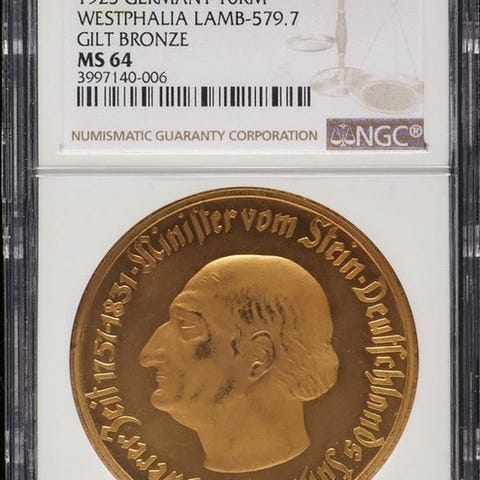 Tyskland Muldenhütten 200 Mark 1923 i aluminium, MS65 af NGC. Klik på den blå "gå til varen" knap, for at købe eller byde på denne vare. Den samlede pris vil blive vist inden du afgiver dit bud.