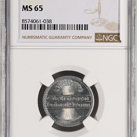 Aluminiumsmønt til Weimar-republikkens periode, udgivet under den tyske hyperinflation i 1923. Den har et nøgternt og funktionelt design, karakteristisk for nødmøntudgivelser, med tydelig typografi på fronten og republikkens ørn med markante streger på bagsiden. Eksemplaret viser fulde reliefs, fremragende definition i fjerdragten og indskrifter, og rene felter med ensartet original glans. Fremragende bevarelse for typen, med minimal tilstedeværelse af overfladiske