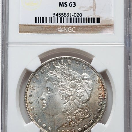 Sølvmønt i Morgan Dollar-typen med Liberty-buste set mod venstre, iført frihedshat dekoreret med bomuldsblade og hvedekim, i naturalistisk stil og med veldefineret relief kendetegnet ved George T. Morgans design. Bagper: heraldisk ørn med udspredte vinger, der holder pile og olivengren, omgivet af åben plantekrone og nationale slagord. Fremviser fremragende oprindelig glans med lyse felter og sølvreflekser, mens ørnernes fjerdragt og hårets krøller bevarer markant skarphed. Et tiltalende eksemplar, repræsenterer de rige