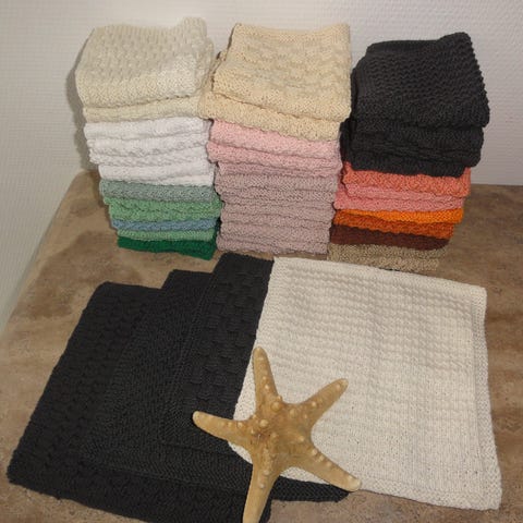 Homemade strikkede små håndklæder i en grå-beige og mørkerød farve, egen produktion