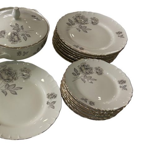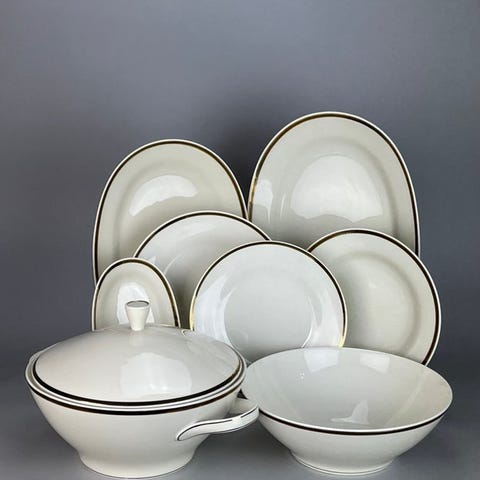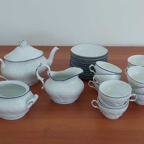 Det består af 12 flade tallerkener, 11 dybe tallerkener og 12 desserttallerkener.