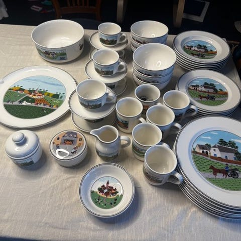 Smuk porcelænsservise fra serien Bauernblume (tysk for 'landlig blomster') fra det tyske mærke Villeroy & Boch. Det kendetegnes ved håndmalede motiver af farverige blomster og grønne kanter. Som tilbehør til servicen er der et sæt skeer og gafler med håndtag, der passer til mønsteret på middagsservicen.