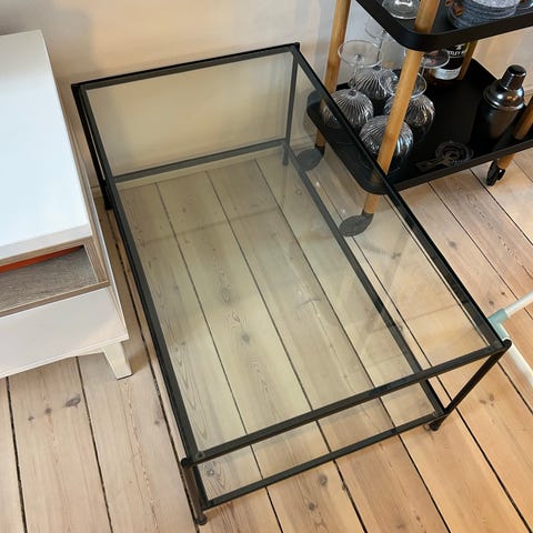 Stilrent sofabord med klar glasplade og solidt sort metalstel. Der kan også indsættes andet i stedet for glaspladen.