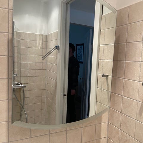 ENHET Ikea Spejlskab til badeværelse i hvid. Skabet har spejllåge på forsiden og flere indvendige hylder som kan reguleres til opbevaring af toiletartikler eller andre småting.