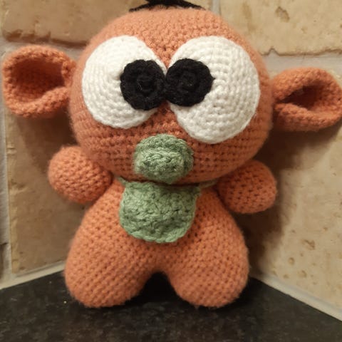 hæklet bamse i gul farve. Bamsen forestiller en lille figur med broderede øjne og næb samt orange garnhår på toppen. Fremstillet i blødt, hæklet garn. Egnet som legetøj eller pyntegenstand på børneværelset.