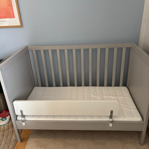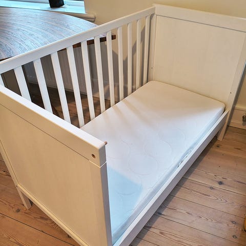 Vi sælger vores hvide SUNDVIK tremmeseng fra IKEA, som måler 60 x 120 cm. Købt i 2021 og fremstår i rigtig god stand uden skrammer eller ridser.
