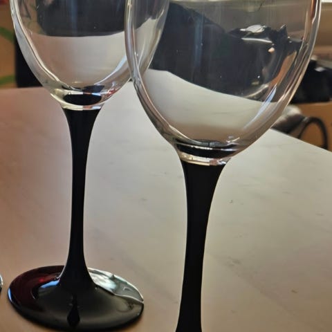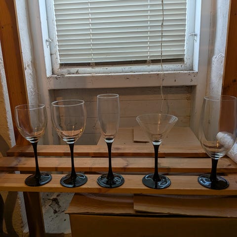 Sæt med assorteret glas fra Luminarc Domino-serien. Klassisk design med sort stilk, der passer til både hverdag og fest. Fremstår i pæn stand uden skår.
