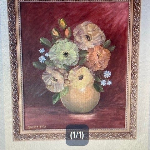 Stort, Flot og dekorativt blomsterprint med motiv af hvide iris i vase. Billedet har et klassisk og romantisk udtryk med varme beige/rosa nuancer og fine detaljer i baggrunden.