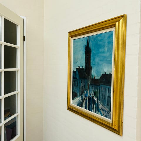 Motiv af en natlig byscene. Billedet viser et hus og omkringliggende bygninger, en bil samt flere personer i gadebilledet. Farverne er overvejende mørke nuancer med lys omkring huset og måne på himlen. Maleriet er indrammet i en enkel, gylden træramme.