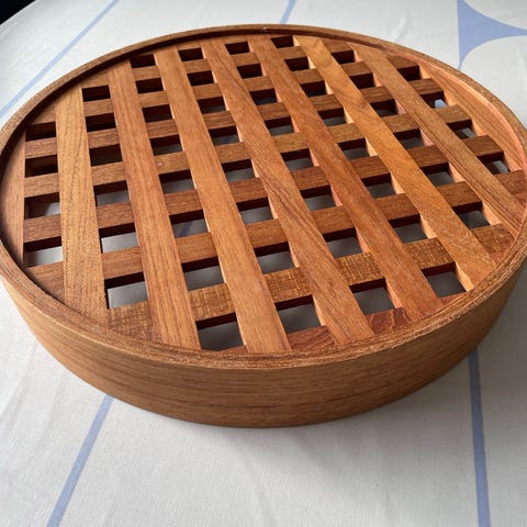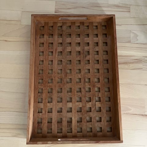 Skagerak Trip Trap bakke i teak træ med gittermønster i bunden og integrerede bærehåndtag i siderne. Rektangulær form, velegnet som serveringsbakke eller til opbevaring på bord eller køkkenbord. Klassisk træfinish med lille metalplade med Trip Trap-logo på siden.
