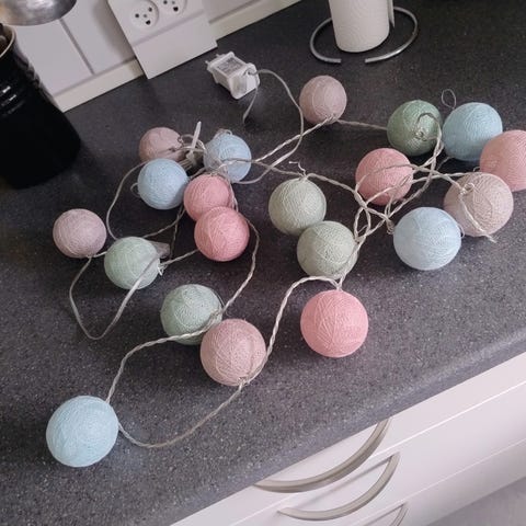 Ukendt lyskæde i klar plast med små kugleformede pærer. Lyskæden har gennemsigtig ledning og er egnet til indendørs brug ved forskellige højtider og dekorationer. Kan anvendes som stemningsbelysning på bord, hylde eller omkring andre genstande. den er ca 3,5 meter lang og kan kobles til flere lyskæder som den.