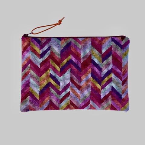 Der bliver syet på stramaj med 4,4 sting/cm og der syes med hele korssting i uldgarn.