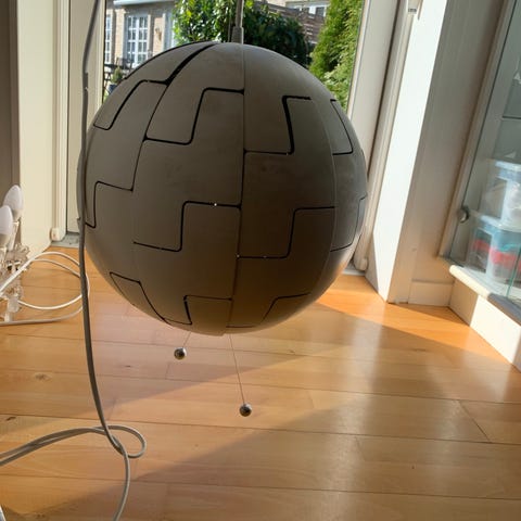 Klassisk lampe fra ikea med Chrome indvendig. Kan åbnes og lukkes og give forskelligt udtryk. Koppen til skjule ledningen i loftet er knækket (se foto). Helt standard som kan udskiftes for meget få kroner eller erstattes med noget bedre kvalitet.