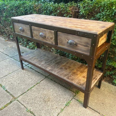 Antikt Svensk Konsolbord/Arbejdsbord/Disk/Blomsterhandlerbord/Langbord/Køkkenbord i patineret fyr og egetræ.