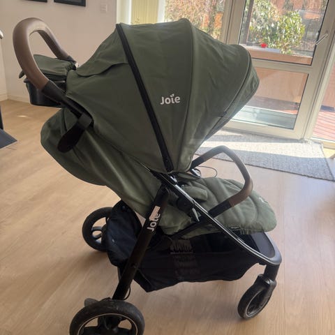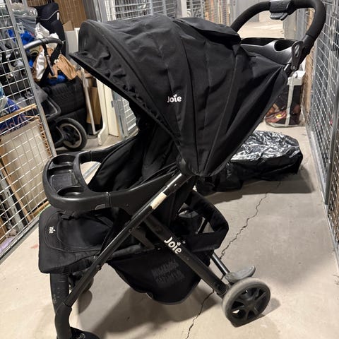 Joie klapvogn i sort. Vognen har justerbart ryglæn, kaleche og frontbøjle. Den er udstyret med fire hjul og kan klappes sammen til en kompakt størrelse, som gør den egnet til transport og opbevaring