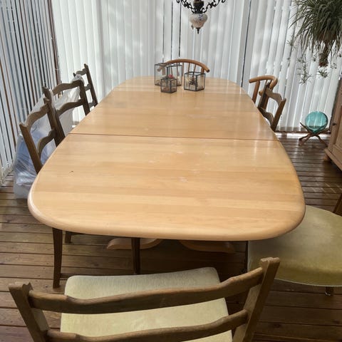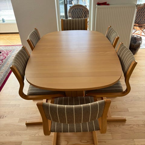 Spisebord med 6 stole. Vil tro det er bøg.