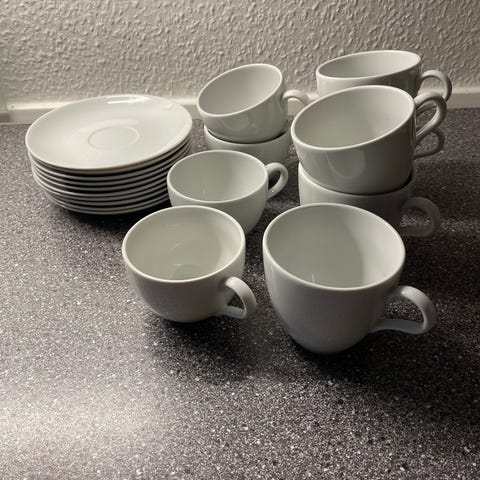 6 store og 13 små kopper incl. underkopper + 12 kagetallerkener. Kun brugt få gange. Ingen skår.