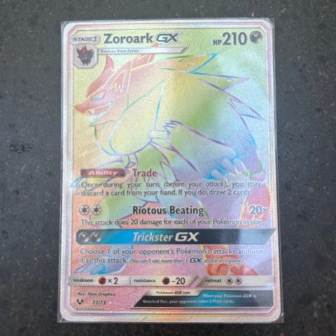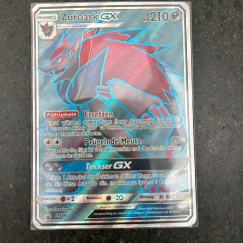 Pokémon Zoroark GX samlekort. Motivet viser Zoroark GX på forsiden og standard Pokémon-bagside. Kortet er egnet til samling og brug i Pokémon Trading Card Game afhængigt af sprog og regelsæt. Yderligere detaljer om sæt, sprog og udgave kan ses på selve kortet.
