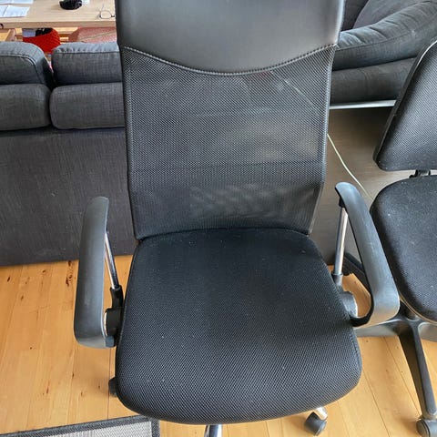 Kontorstol / drejestol med polstret sæde og buet ryglæn i sort kunstlæder. Stolen har fembenet fodkryds i krom med hjul, der gør den let at flytte rundt. Egnet til brug ved skrivebord, arbejdsplads eller hobbybord i hjem eller kontor.