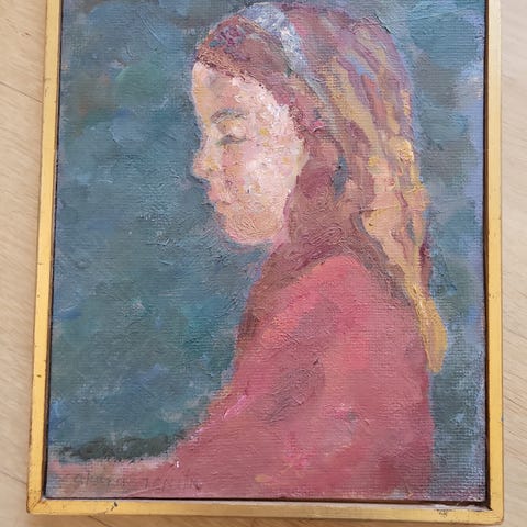 Groth Jensen oliemaleri med motiv af en pige, der spiller klaver. Måler 45x55 cm. Farvepaletten er overvejende blålige og grønne nuancer med lyse, neutrale toner i baggrunden. På bagsiden fremgår kunstnernavnet Groth Jensen samt årstallet 1975 og titlen "Nina". Maleriet er indrammet i en enkel træramme. Du må komme her og hente det, det er for stort til, at jeg tør sende det.