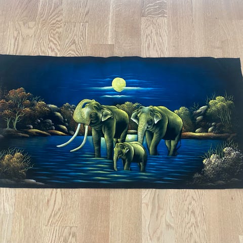 Dette er en håndlavet "Thunpath Rana" elefantfamilie vægdekoration, typisk lavet af materialer som tørre palmeblade og sand på fløj. Trykket er monteret i en rektangulær guldfarvet træramme med lys passepartout. På bagsiden er målet angivet til 10x15 em, altså ca 25x38 cm. Billedet er indpakket i plast og har beskyttelseshjørner på rammen. Velegnet som vægdekoration i stue, soveværelse eller gang. Helt nyt og aldrig brugt.