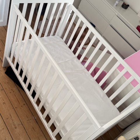 JLY tremmeseng i hvidmalet træ. Klassisk model med tremmer hele vejen rundt og lamelbund i træ. Sengen er velegnet til spædbørn og småbørn og kan bruges som almindelig babyseng i børneværelset. Designet giver god ventilation omkring madrassen og mulighed for at holde øje med barnet fra alle sider.