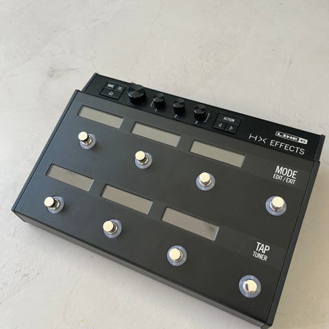 Line 6 HX One guitar effektpedal i sort. Kompakt multieffekt-enhed med display, fire drejeknapper og to fodkontakter. Pedalen har stereo ind- og udgange (L/mono og right), send/return, ekspressions-/ekstra fodkontaktindgang (EXP/FS 3/4) samt MIDI in og MIDI out/thru. Strømtilslutning 9V/500 mA via standard center-negativ adapter. Velegnet til elektrisk guitar og andre instrumenter, der kræver fleksibel effektstyring i pedalboard-format.