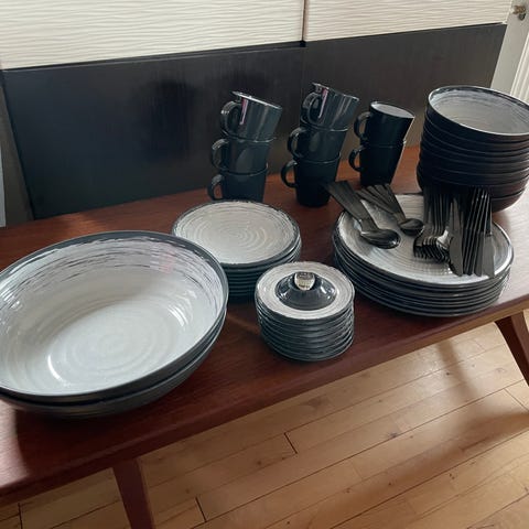 Pænt og nydeligt beige stel med rustik, bølget og let farvet kant af Home Collection. Så hvis du står og mangler tallerkner enten fordi du flytter hjemmefra eller bare trænger til fornyelse af tallerkner. Så er det her nogle super fine tallerkner i meget god stand og kraftig kvalitet. Tåler opvaskemaskine, ovn, fryser og mikrobølgeovn. Har ingen skår.