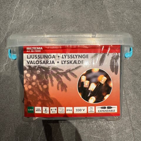 Biltema lyskæder med LED-lys til jul. Lyskæden er velegnet som julebelysning indendørs eller udendørs, afhængigt af produktets specifikationer på emballagen. Kæden kan anvendes til dekoration af fx juletræ, vinduer, altan eller andre områder, hvor der ønskes juleslys. LED-teknologien giver et lavt strømforbrug og lang levetid sammenlignet med traditionelle glødepærer. Produktet kan eventuelt udbygges med flere sektioner, hvis dette fremgår af pakken som "expandable". Farve på ledning og lys fremgår af billederne og emballagen.