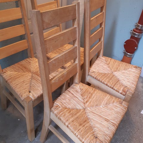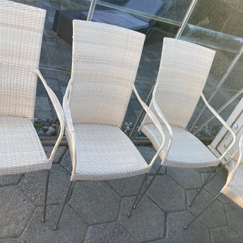 4 spisebordsstole i flet og med hynder. Rigtig god siddekomfort. Kan også bruges i udestue.