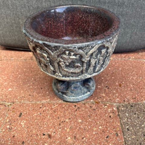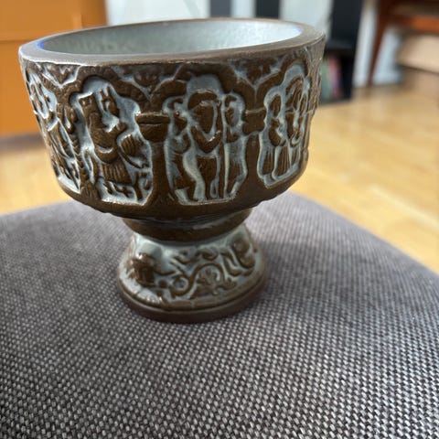 Keramik, Skål, Michael Andersen, Kopi af døbefonten i Aakirkeby på Bornholm, 14.5cm høj og 15cm diameter ovenpå. Lavet af Michael Andersen i stentøj med glasur, nr 4645/2. Ingen skår/afslag.