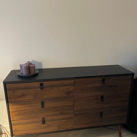 Kommoden er kun 4 måneder gammel og kun været brugt meget lidt. Toppen har dog fået en ring, som fremgår af billederne. Dette er det eneste brugsspor på kommoden - resten fremstår som ny