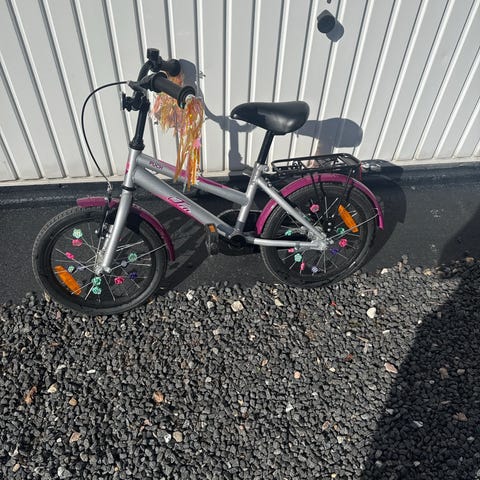 Børnecykel med 16" hjul i sort/blå. Cyklen har bagagebærer, kædeskærm, skærme for og bag samt reflekser i hjulene. Sadel og styr kan justeres i højden, så cyklen kan tilpasses barnets størrelse. Velegnet som hverdagscykel til børn i den størrelse, der passer til 16" hjul.
