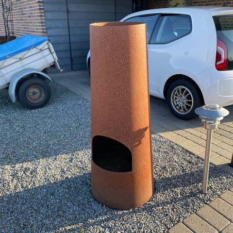 Fritstående havepejs i sort udførelse med glasafskærmning omkring flammen. Pejsen er søjleformet og egner sig til brug på terrasse eller altan, hvor den kan give lys og varme. Glasafskærmningen hjælper med at beskytte flammen mod vind og giver frit udsyn til ilden. Velegnet som fast element i uderummet, hvor der ønskes en lodret, pladsbesparende løsning til udendørs ild.
