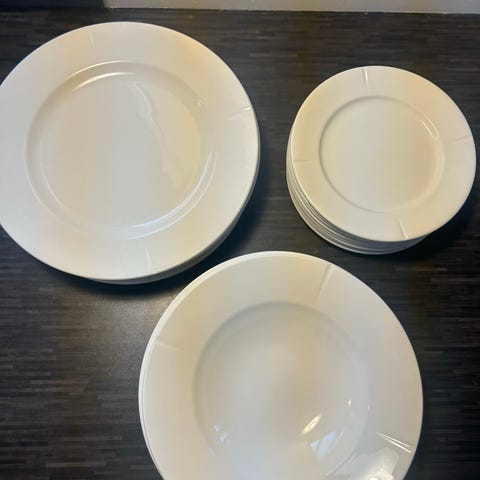 Der er 12 middagstallerkner i met fin stand uden skår. De 4 frokosttallerkner følger gratis med.