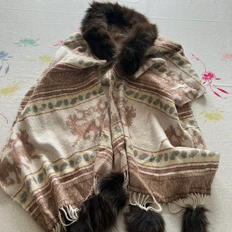 En fin stola i en god stand, det er ikke ægte pæls men den er alligevel virkelig lækker og dejlig varm ,kunne sagtens bruges i stedet for tæppe/trøje mens man hygger i stuen og så er der lommer til hænderne