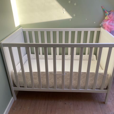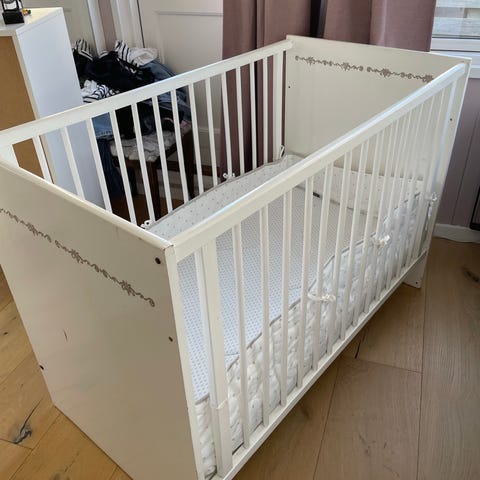 Klassisk tremmeseng i hvid med madras, rullemadras 3 lagener, 2 tisselagener, og fin sengerand - gives gratis ved afhentning