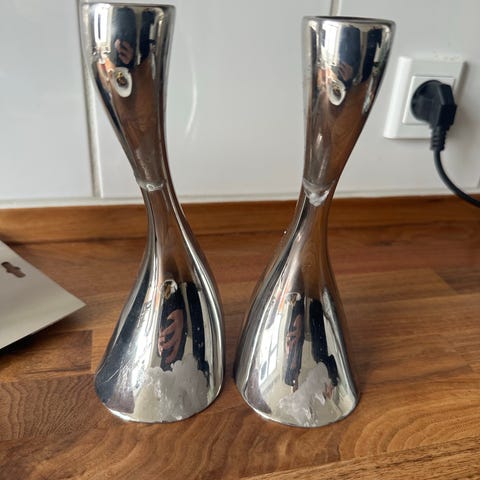 3 Georg Jensen Cobra lysestager, i rustfrit stål. Højde 16, 20 og 24cm. Lidt brugsspor, ellers er de fine.