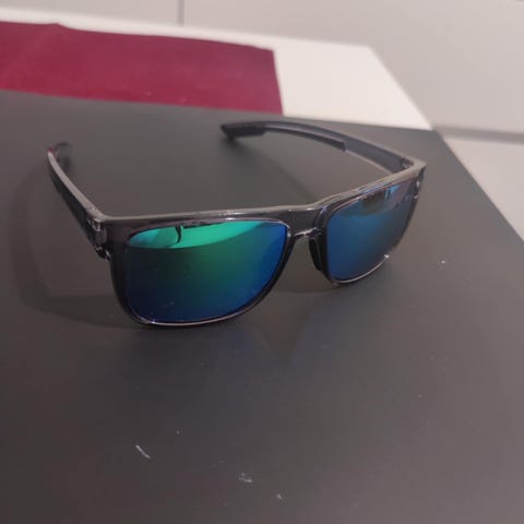 Hawkers solbriller til unisex med rund facon. Stel i mønstret plast og blå spejlglas. Velegnet som hverdagssolbriller til både mænd og kvinder.