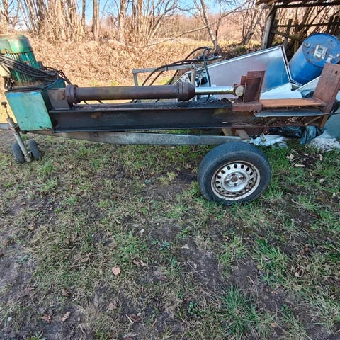 Elektrisk brændekløver i rød og sort. Maskinen er en vandret model med el-motor og hjul for nem transport. Egnet til kløvning af brændeemner til brug i brændeovn eller pejs. Tilsluttes almindelig strøm via ledning. Konstruktionen er i metal.