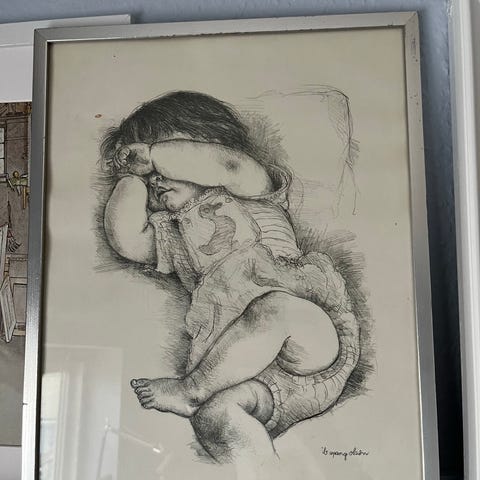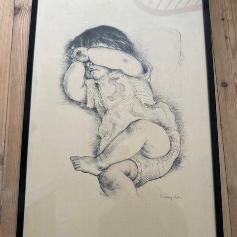 Indrammet tegning/kunsttryk med motiv af sovende barn. Sort-hvid stregtegning i enkel ramme med glas. Ophæng på bagsiden med snor. Velegnet som vægdekoration i f.eks. stue, soveværelse eller børneværelse.