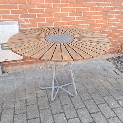 Pietra havebord fra Ilva. 150 cm. i diameter. Bordet har rund bordplade i træ med midterfelt i granit og sort metalstel. Træet trænger til at blive slebet. Cannes havestole også fra Ilva. Stolene har sorte plastskaller og ben i træ. Nypris for hele sættet kr. 12.800.