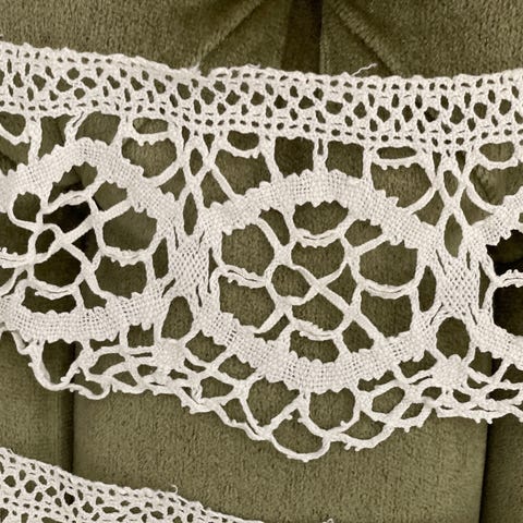 Blonde i hvid farve med bladrigt mønster. Velegnet til syning og dekoration af f.eks. kjoler, kostumer, brudekjoler, brudeslør, puder eller andre tekstilprojekter. Kan sys eller limes på stof efter behov. kan bruges enkeltvis eller i serier langs kanter og sømme.