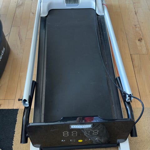 Benefit løbebånd med elektronisk display og betjeningspanel. Løbebåndet har sikkerhedssnor, håndtag i fuld bredde og integreret konsol med knapper til hastighed og programmer. Egnet til indendørs gang- og løbetræning i hjemmet. Strømtilslutning via medfølgende ledning.