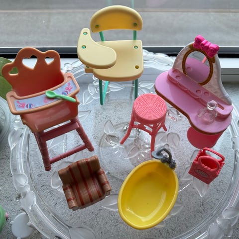 Dukkehus babysæt med møbler i rødlakeret træ. Sættet består af tremmeseng, puslebord med skuffer og skabslåge, højstol samt rundt legestativ. Og en lille vippestol. De små madrasser og polstrede flader har samme blomstrede tekstil.