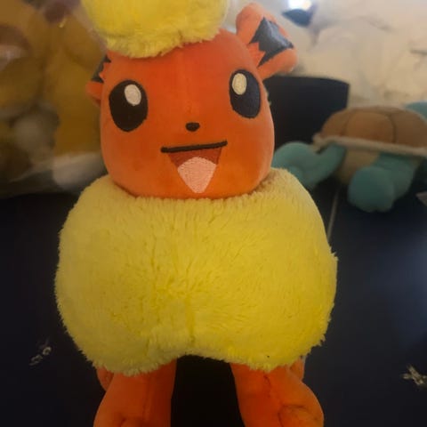 Pokémon Charmander plysdyr i orange med lys bug og flammedetalje på halen. Blødt tøjdyr egnet som krammelegetøj eller pynt på børneværelset. Figuren forestiller Pokémon-karakteren Charmander med åbent gab, små tænder og broderede øjne. Materiale er blødt tekstil med fyld. Velegnet til børn, der kan lide Pokémon-universet.
