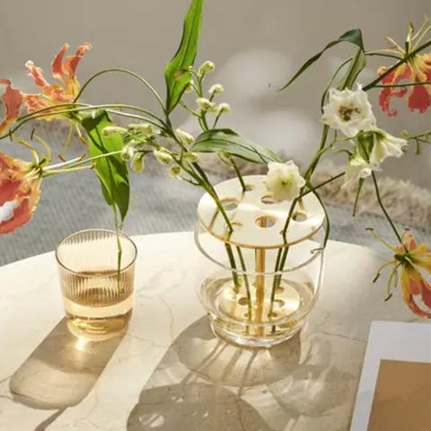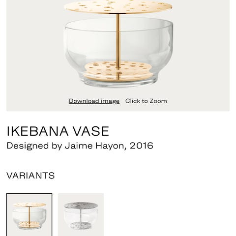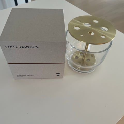 Fritz Hansen vase med messingindsats og glas . Skålen er rund og gennemsigtig, mens låget og den indvendige indsats er udført i børstet messing med huller i forskellige størrelser. Velegnet som dekorationsskål, fx til enkelte blomsterstiklinger, lys eller andre pyntegenstande.