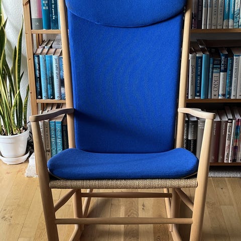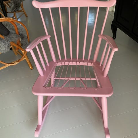 Super fin og nyrenoveret gyngestol. Slebet og malet almueblå med ny polstring og betræk.